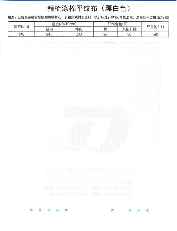 纤维含量:聚酯纤维80%、棉20%(含导电纤维);幅宽:150cm,单位面积质量:160g/㎡;