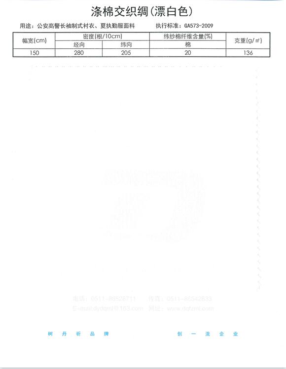纬纱棉纤维含量20%,平纹织物,单位面积质量136g/㎡