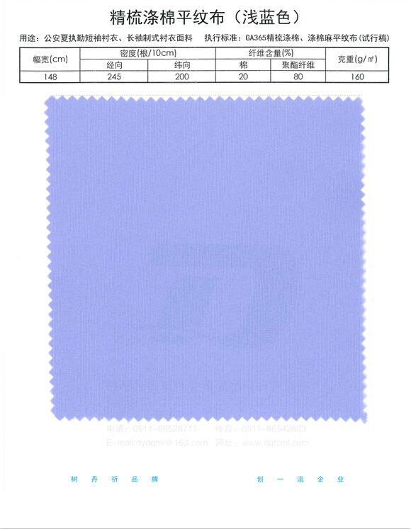 纤维含量:聚酯纤维80%、棉20%(含导电纤维);幅宽:150cm,单位面积质量:160g/㎡;